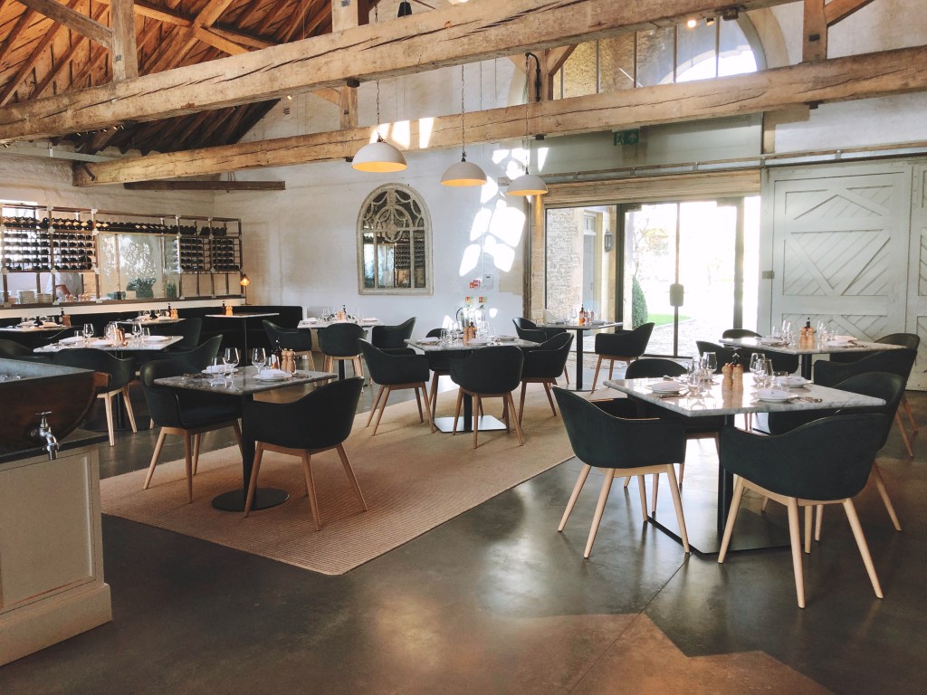 The Ox Barn. Formerly a nineteenth-century oxen house, the Ox Bar has been transformed into a contemporary restaurant at the heart of Thyme. Old meets new in this rustic farmhouse that features high ceilings and exposed beams combined with a sleek, modern bar and an assortment of plush, vintage chairs. We snagged a spot on a herringbone-patterned couch in front of the fireplace and enjoyed a few appetizers and cocktails. The kitchen at the Ox Barn is headed up by Charlie Hibbert, the Thyme’s owners’ son. His food is remarkable, and the ingredients are almost exclusively grown in the kitchen garden. One of my favorite dishes featured at the Ox Barn was the Grilled Aubergine, Borlotti Beans and Sauce Vierge. This was the perfect autumn dish with rich flavors that burst in your mouth.