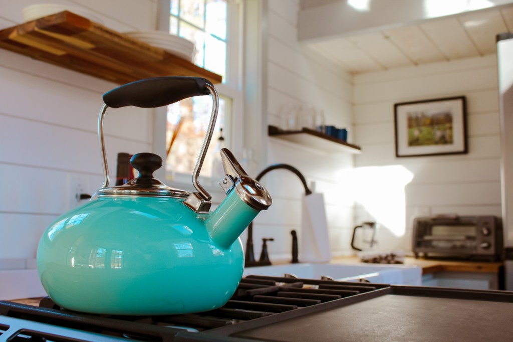 The house is modern yet cozy, well-maintained, and beautifully designed. While some might question the lack of square footage, this tiny space is carefully laid out to maximize usability. It has everything you could need for a couple’s getaway weekend, including a full kitchen with a four-burner gas stove and oven, washer and dryer, electric fireplace and a bedroom loft with a queen mattress. On our second night in the house, we popped over to the local grocery store, D&K’s Grocery Store, and bought ingredients to make spaghetti and meatballs. The four-burner gas stove, farmhouse sink, and butcher-block countertops made it very convenient to cook a full meal.