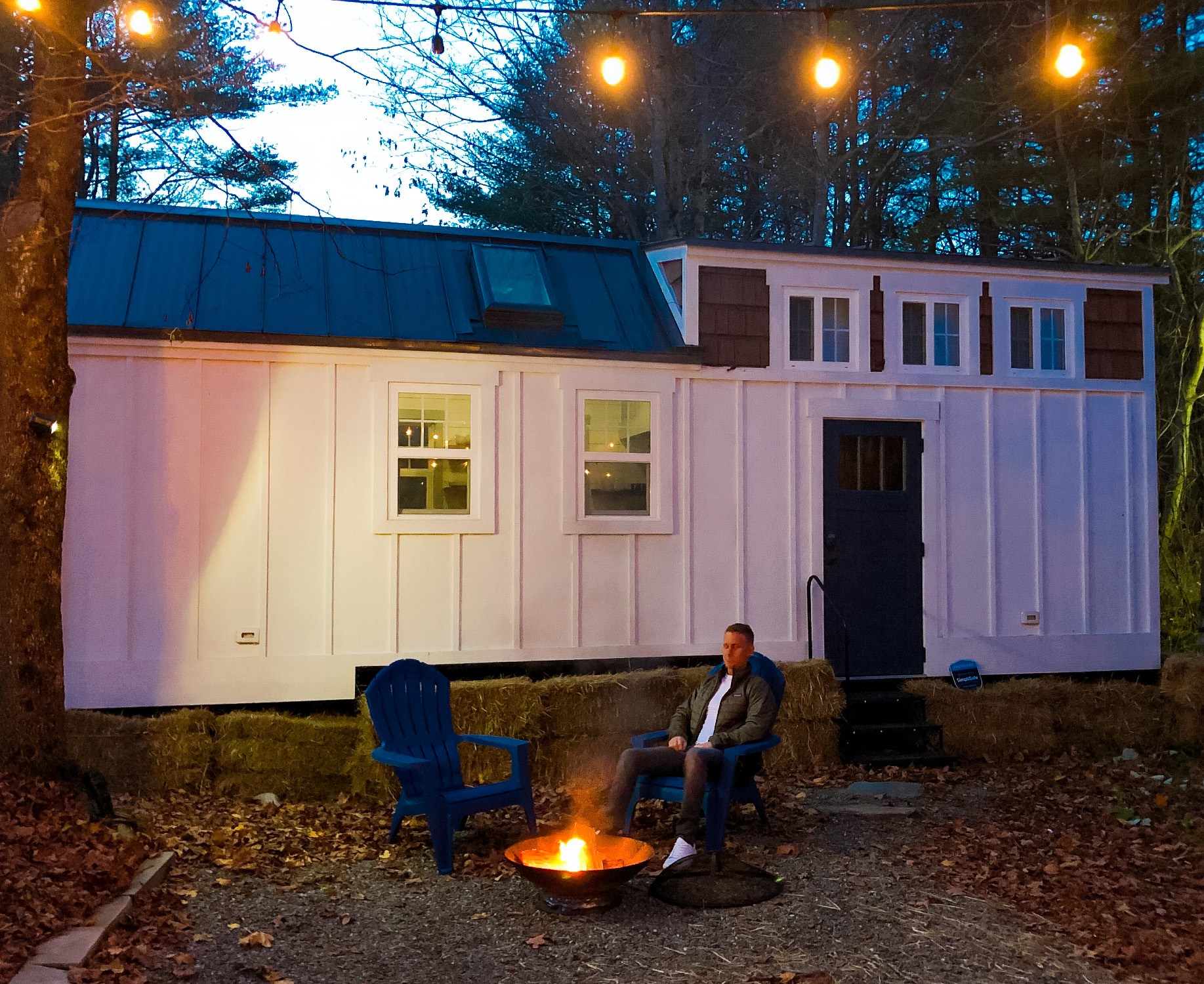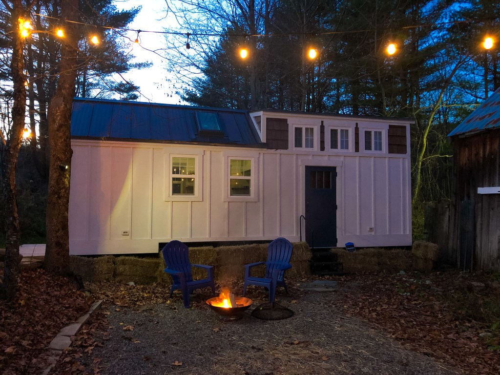 If these amenities don’t sell you, the outdoor space will. The rental is located on the same property as Apple Blossom Cottage (another Airbnb owned by Wildwood Collective). The two homes share a driveway, but the Tiny House lodgers have access to their own separate outdoor space. The outdoor area is scenic and a great place to relax after dinner. String lights suspend from the trees right outside the front door, and to the side of the house is a small porch with two Adirondack chairs and a firepit. The hosts were kind enough to provide us with pre-cut wood so we could enjoy an evening bonfire.